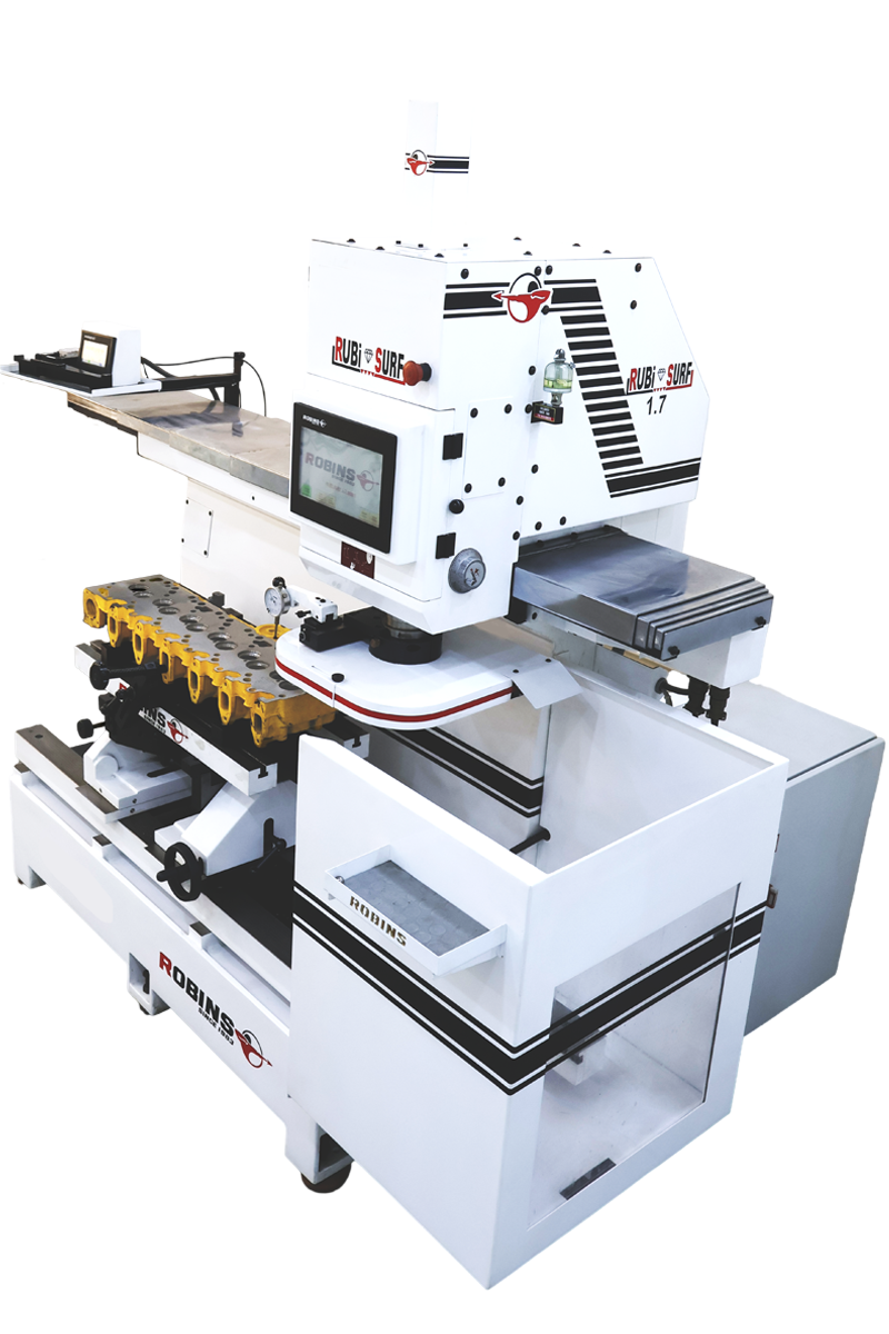 The Robins Rubi Surf 1.7 is a precision resurfacing machine built for cylinder heads and engine blocks from automotive, diesel, and industrial engines. Its rigid cast-iron construction and ball-screw table feed ensure stability and perfectly flat sealing surfaces on both aluminum and cast iron.