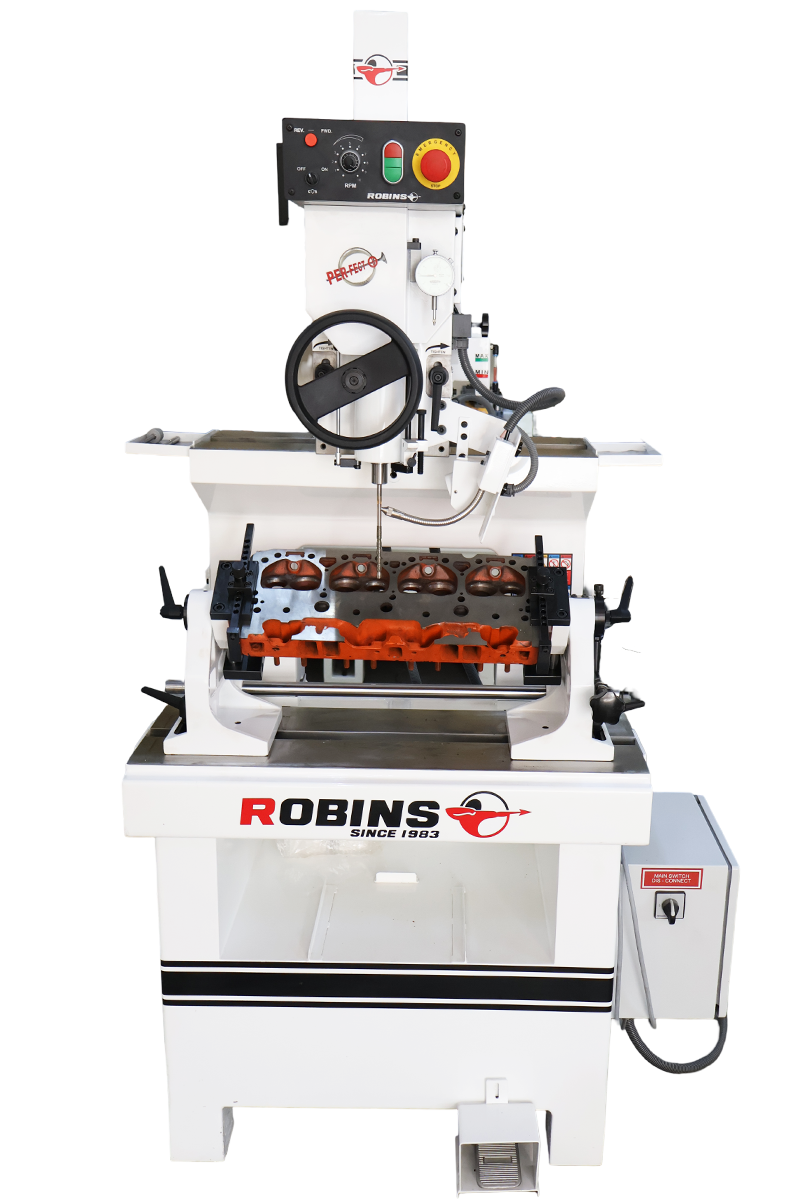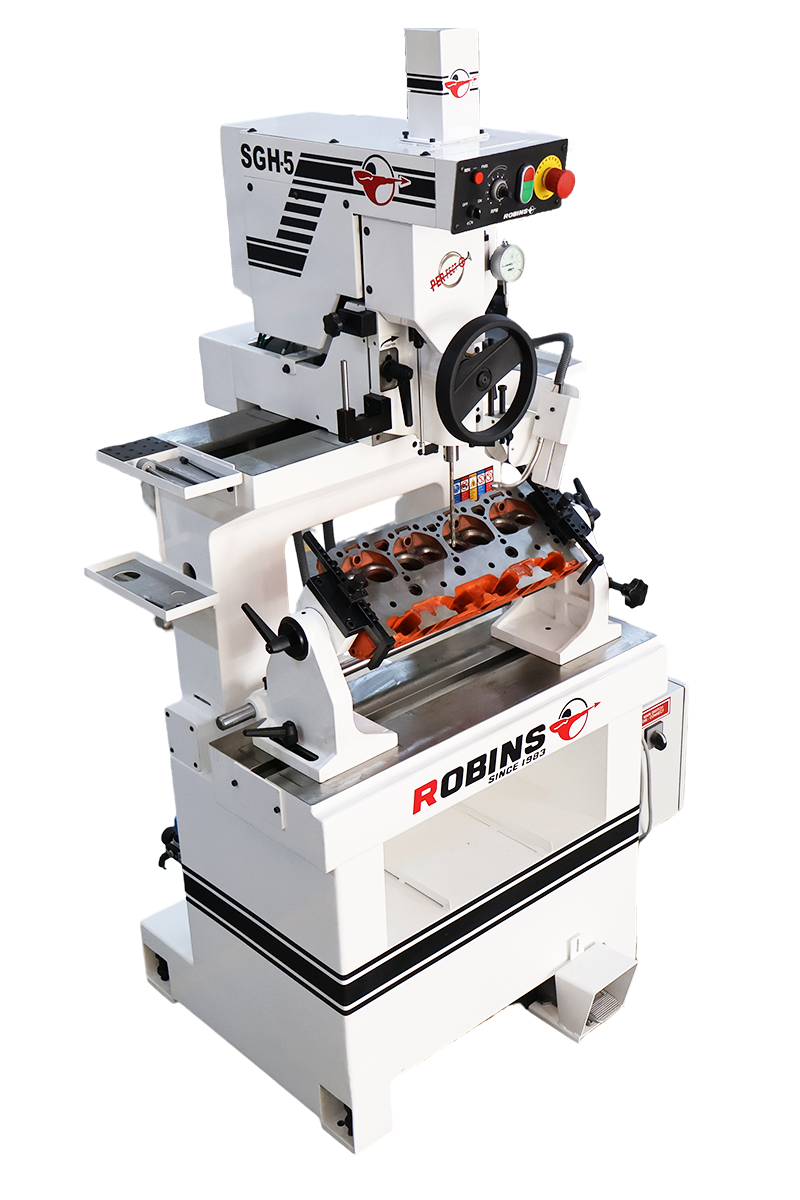 The Robins SGH 5 is a precision valve seat and guide machine engineered for accurate, repeatable machining across all cylinder head types. Its carbide centering pilots and air-float workhead ensure precise alignment between the valve guide and seat. Robins’ multi-angle tooling provides stable cutting performance and minimizes chatter, even on hardened or powder-metal valve seats.