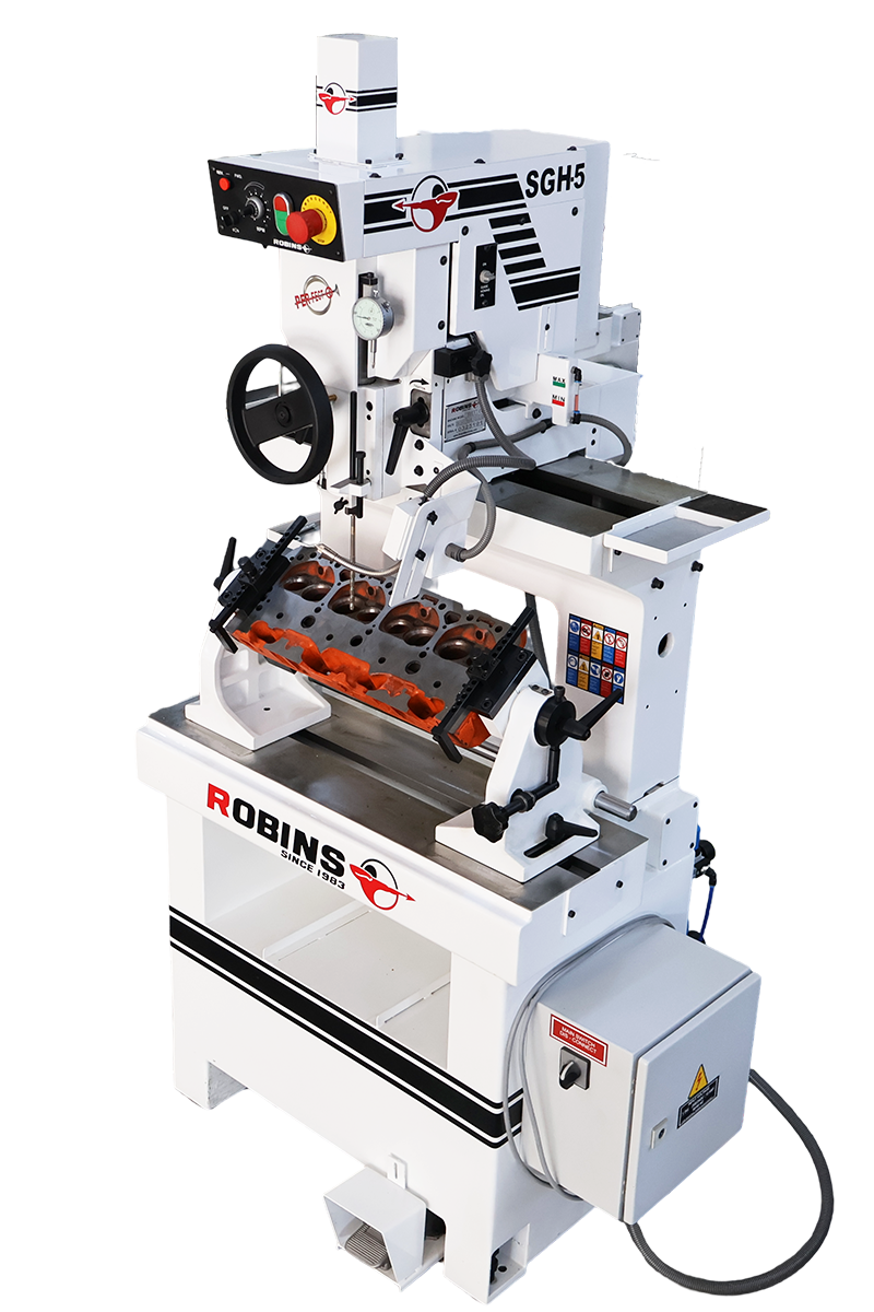 The machine includes a guide-honing process that finishes valve guides to their final size with correct stem-to-guide clearance. Robins is the only manufacturer that allows guide honing directly on the same machine prior to seat cutting, improving guide geometry and delivering superior seat concentricity. With constant-variable spindle speed, forward/reverse rotation for tapping, and ±10° spindle tilt, the SGH 5 is capable of machining domestic, import, performance, heavy-duty, and motorcycle cylinder heads. A complete range of tooling options is available, allowing shops to configure the system to match their workflow and machining requirements.