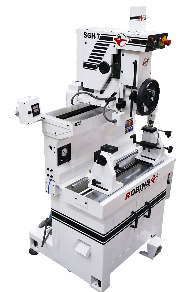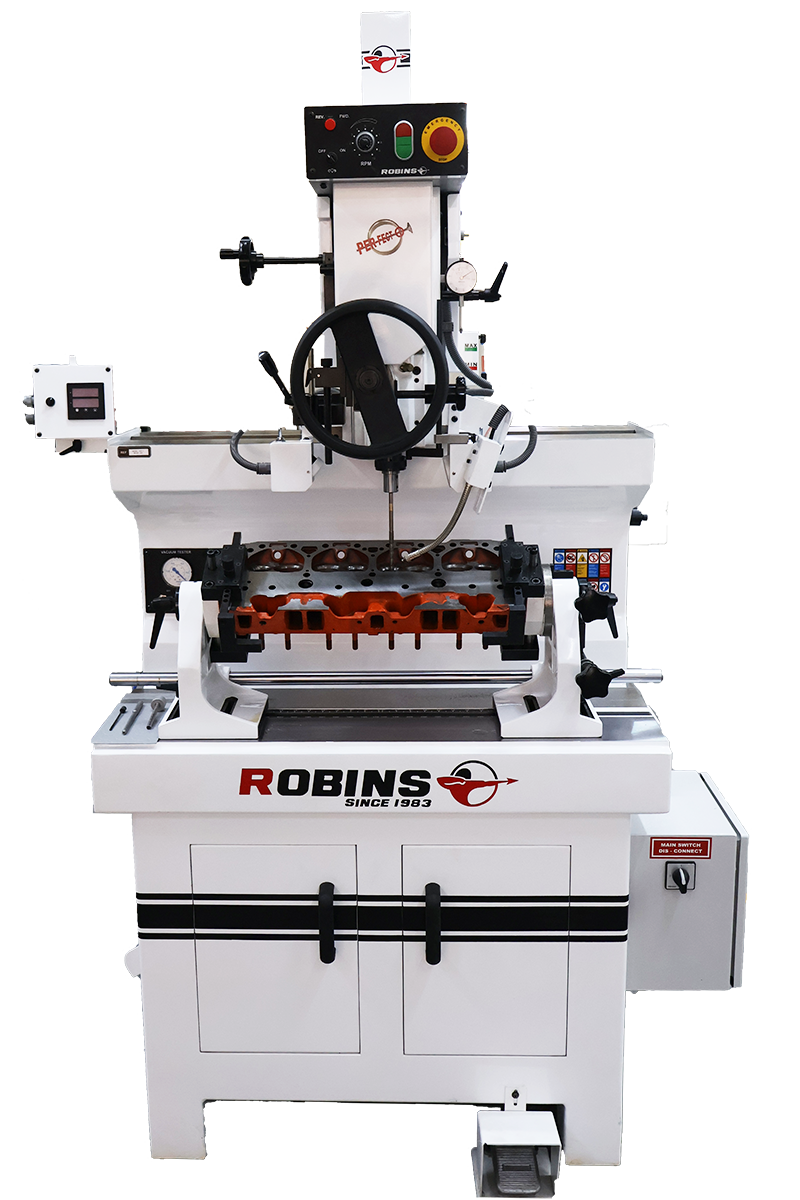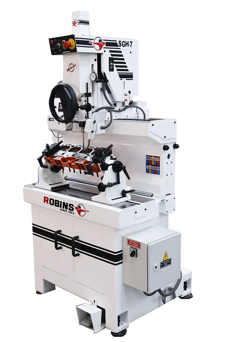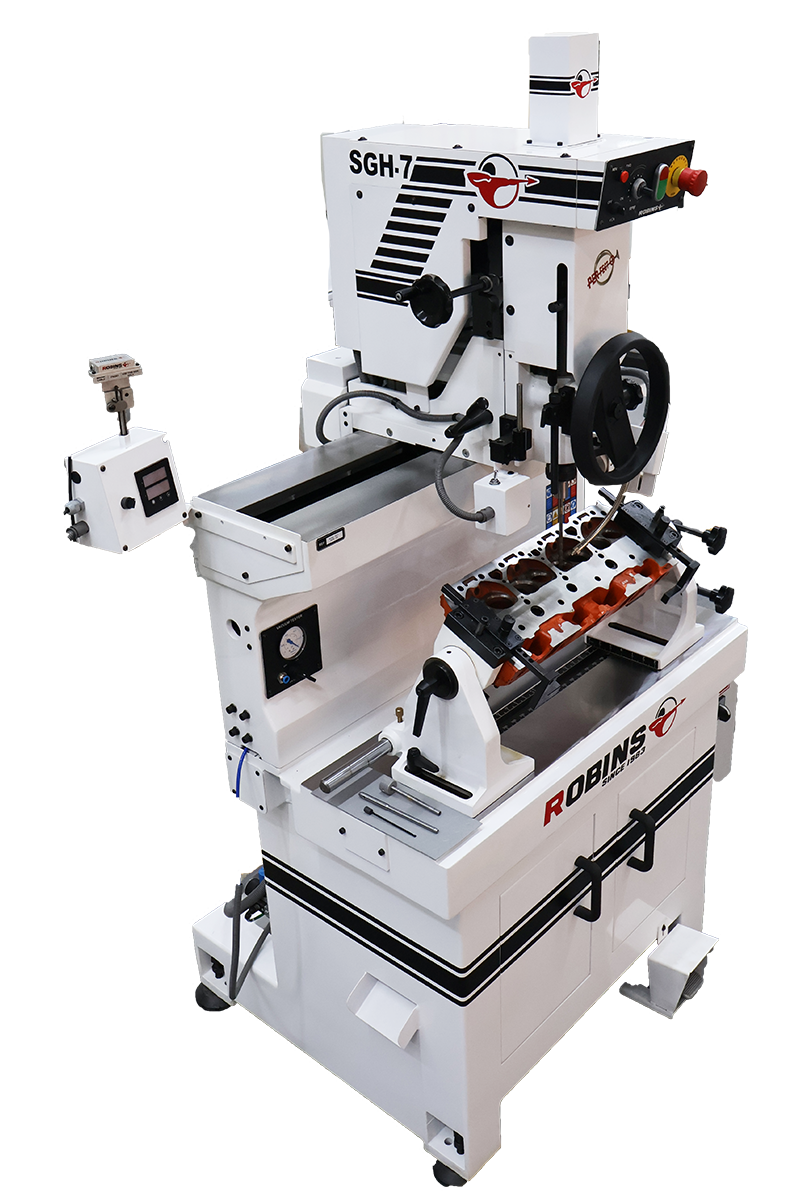 The Robins SGH 7 is a precision valve seat and guide machine built for accurate machining on small to medium cylinder heads. It uses fixed carbide centering pilots and a smooth air-float workhead to maintain precise alignment between the valve guide and seat.”.