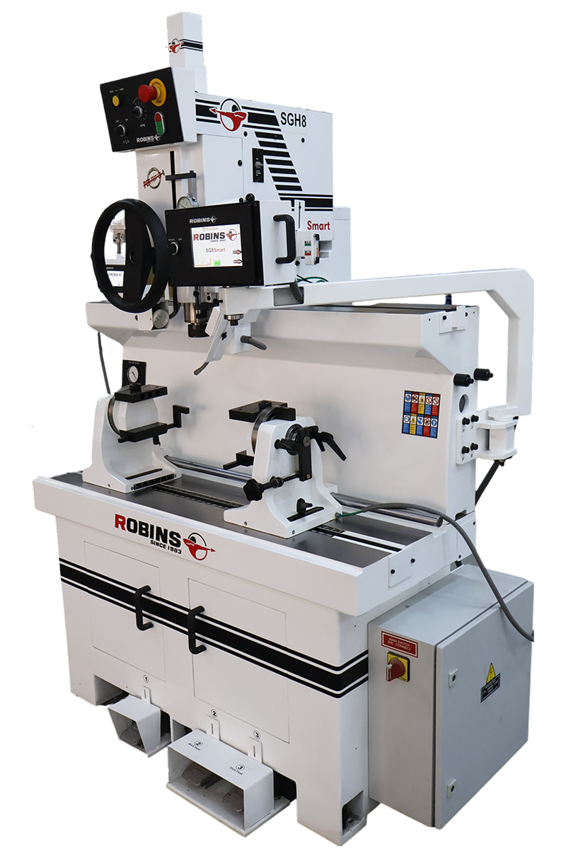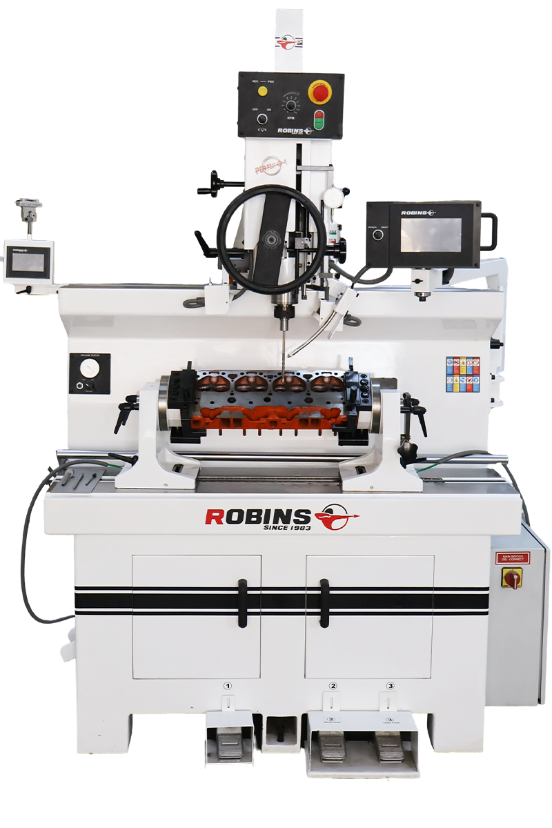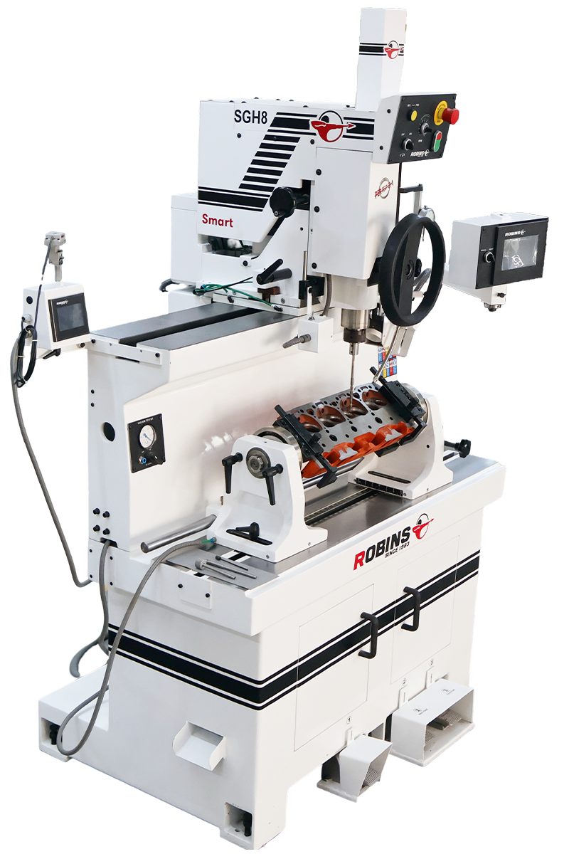 The Robins SGH 8 SMART is a heavy-duty valve seat and guide machine designed for accurate machining on small single-cylinder heads up to large diesel cylinder heads measuring 40″ × 12″ × 6″. Its fixed carbide centering pilots and air-float workhead provide excellent rigidity and maintain precise seat-to-guide alignment, achieving valve seat roundness well below the industry average.